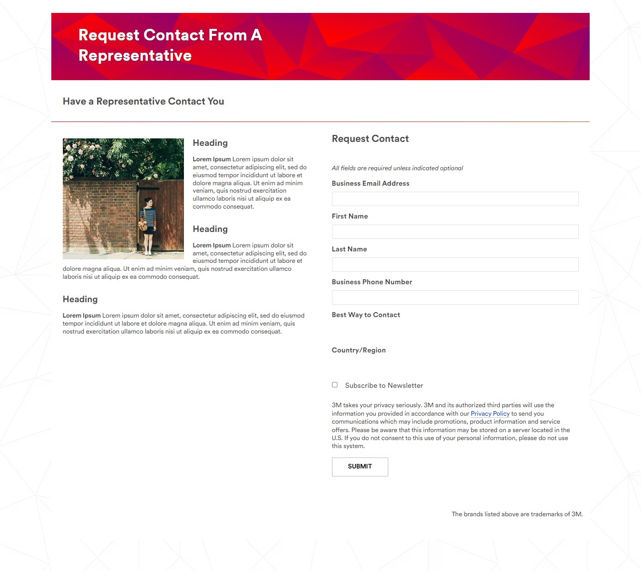 These landing pages, which live at a separate domain from our main website, are typically built by a marketing automation specialist (not a UX designer), using pre-fabricated templates for the content provided by the marketing strategists. The templates are simple, usually consisting of a hero image with text at the top, a single image in the main body, some areas for text, and a contact form, seen in the following screenshot.