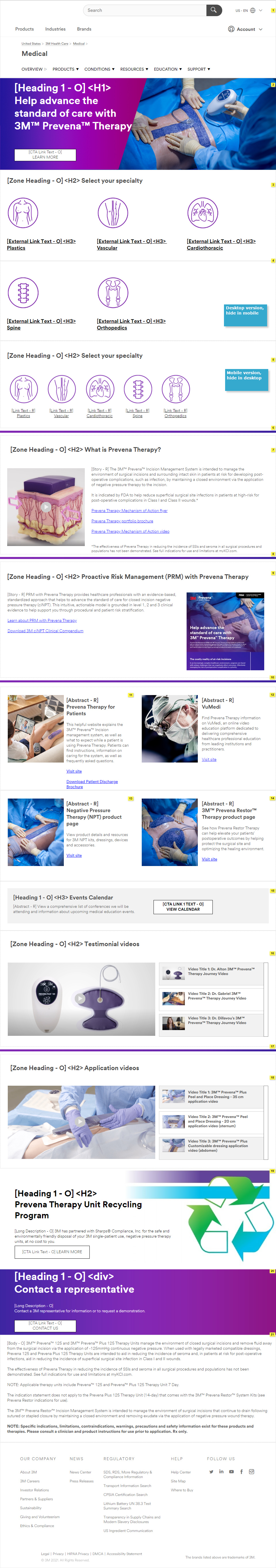 During this project, mobile-first thinking became important, and that is the focus of this summary of the work. Our corporate UX templates were designed primarily around on desktop layouts, with each section of the page existing in a prefabricated desktop layout, as well as a corresponding mobile layout when viewed on mobile devices. During the iteration process, I noticed that some sections looked great in their desktop layout, but not so great in their mobile layouts, which would present a compromised user experience in mobile. And research showed that a majority of surgeons viewed our existing pages on mobile devices.