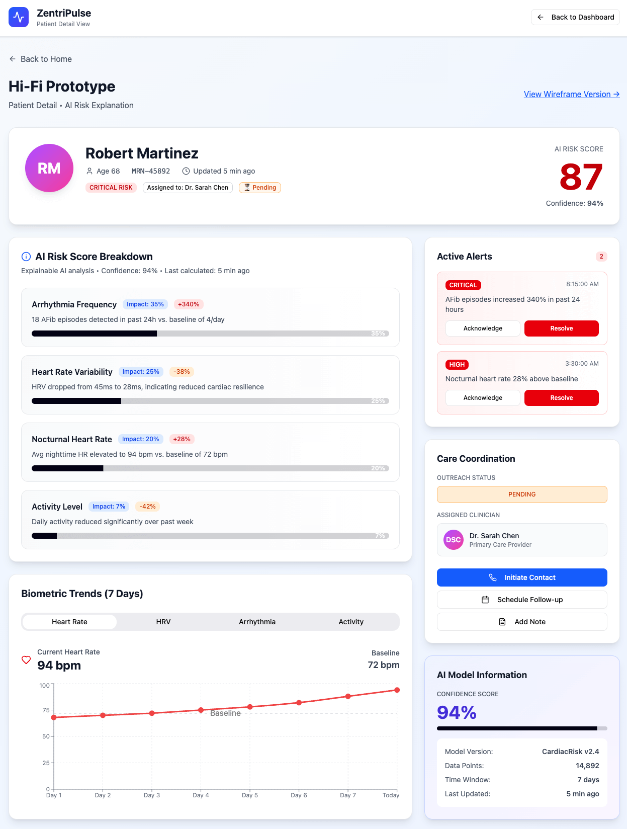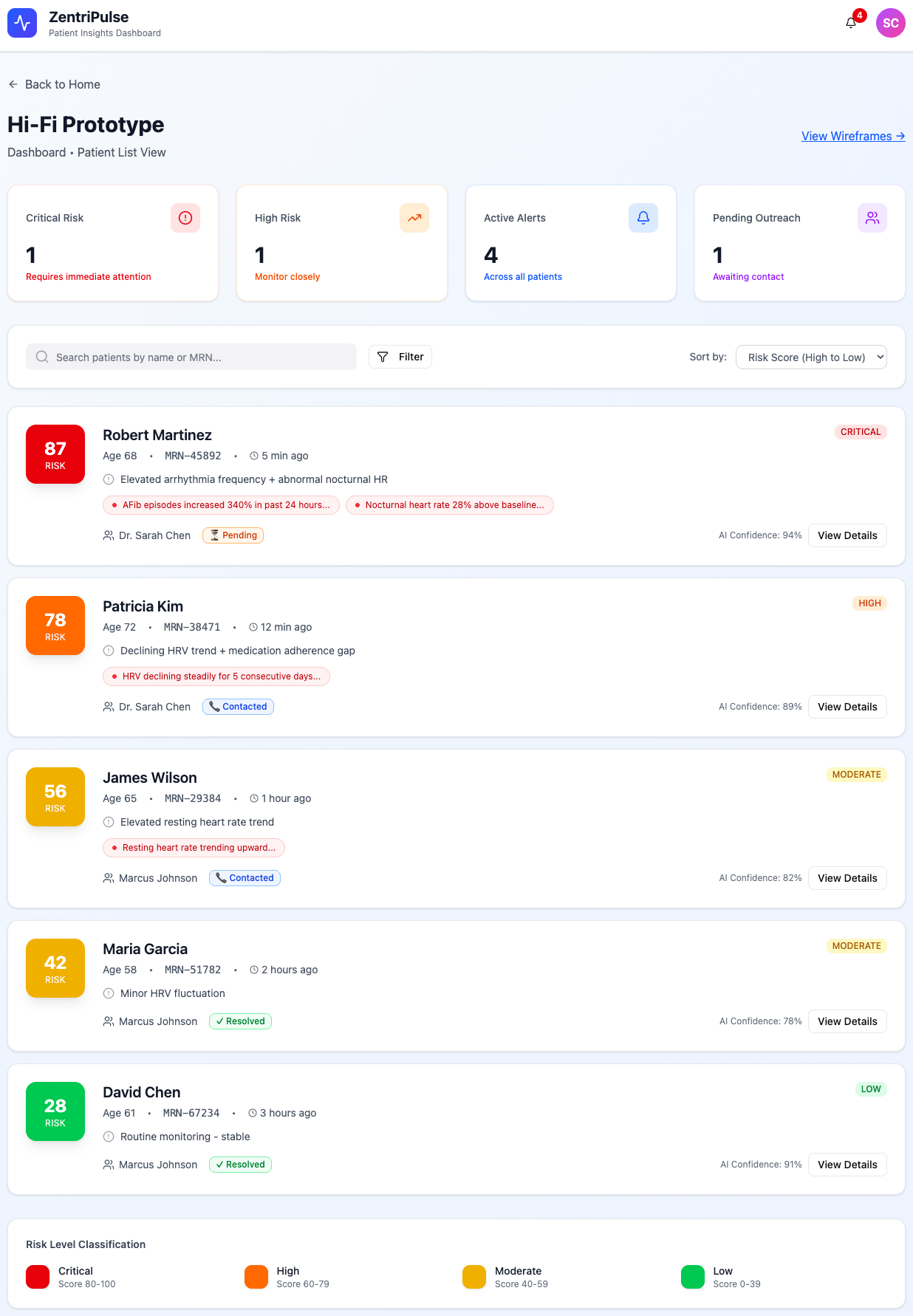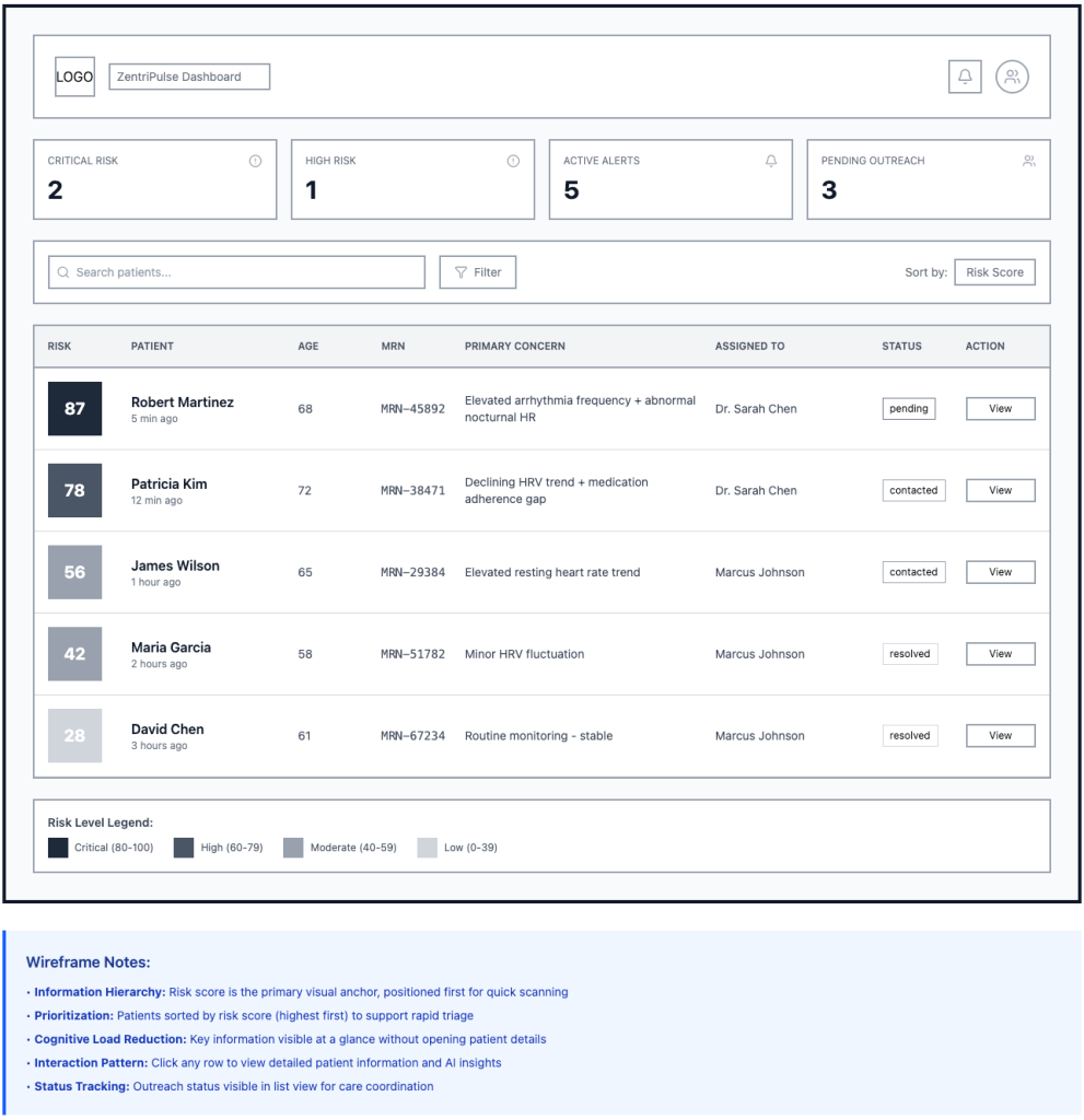 ZentriPulse is a conceptual clinician-facing dashboard designed to transform continuous wearable cardiac data into prioritized, actionable insights.
