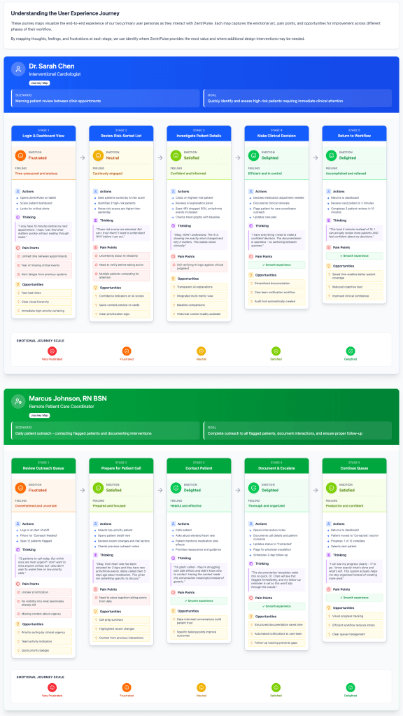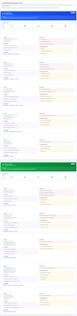 The journey maps shown earlier were the third attempt from Figma Make. Below is the first attempt. I found the format of these journey maps hard to follow. Each persona has an emotional journey consisting of a row of five items across the top, and below that is a column of five sections containing the rest of the data, with each section of the column corresponding to the respective item in the emotional journey row.