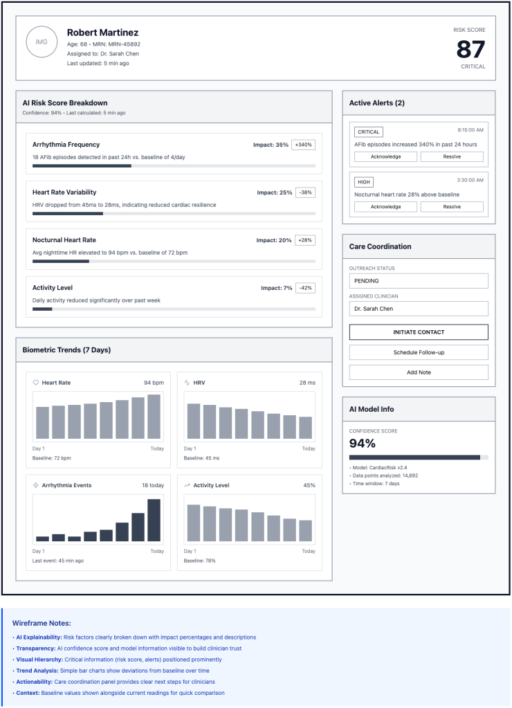 The platform leverages AI-assisted risk modeling to help healthcare providers quickly identify high-risk patients, reduce cognitive overload, and make informed care decisions in remote monitoring environments.
