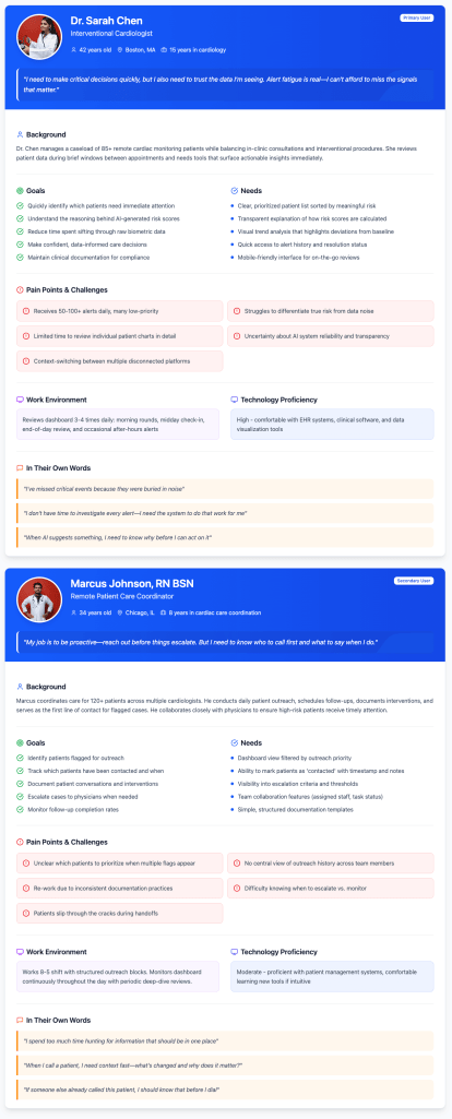 Figma Make generated a primary user persona and a secondary user persona for the project, synthesizing research to include goals, needs, pain points, and quotes that would be typical of these types of users in the healthcare industry.